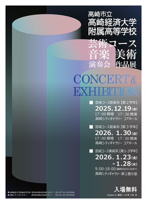 ◆令和5年9月16日(土) 「芸術コース コンサート・作品展」 高崎市民文化会館 音楽系は選抜生徒、卒業生による演奏、歌唱、全員合唱等を行いました。 美術系は1・2年生が作品(油絵、彫刻、デザイン)を展示をしました。 《終了しました》 |