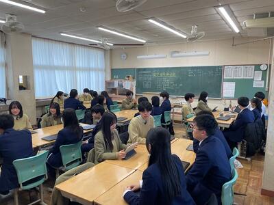 高崎北高校との「総合的な探究の時間 合同発表会」が12月16日に行われました。生徒たちは各自が設定した多種多様なテーマによる探究成果を発表し、少人数のグループに分かれて意見交換を行いました。